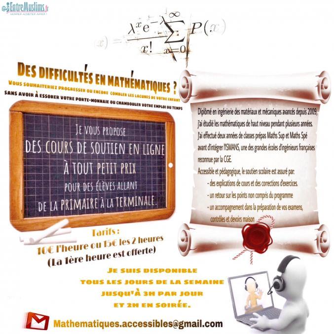 Je vous propose des cours de soutien en ligne à tout petit prix* pour des élèves allant de la primaire à la terminale.