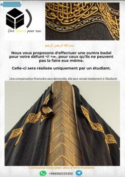 Resident en Arabie, nous proposons un service qui vous permettra d'effectuer une oumra au nom d'un défunt ou d'une personne malade dans l'incapacité de la faire ( contactez nous pour les conditions).