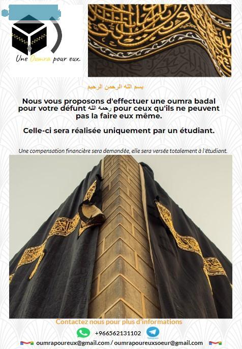 Nous proposons d'effectuer la oumra pour votre proche décédé رحمه الله par un étudiant sur place contre une compensation financière qui sera versée à l'étudiant pour améliorer son quotidien inch'Allah.