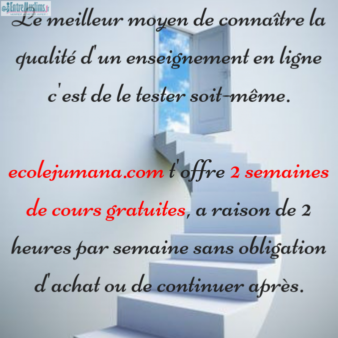 Chers frères, chères soeur, ecolejumana.com vous propose 2 semaines de cours gratuites a raison de 2 h par semaine aménageables en 4 fois 30 min.