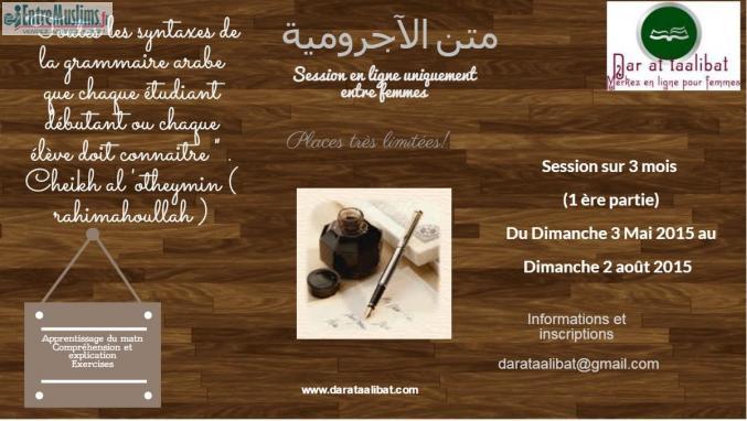 L'équipe est heureuse de vous présenter la nouvelle session en ligne uniquement entre femmes qui aura lieu début Mai et ce durant 3 mois in sha allah pour la 1 ère partie de l'excellent livre de grammaire al ajroumiyya.