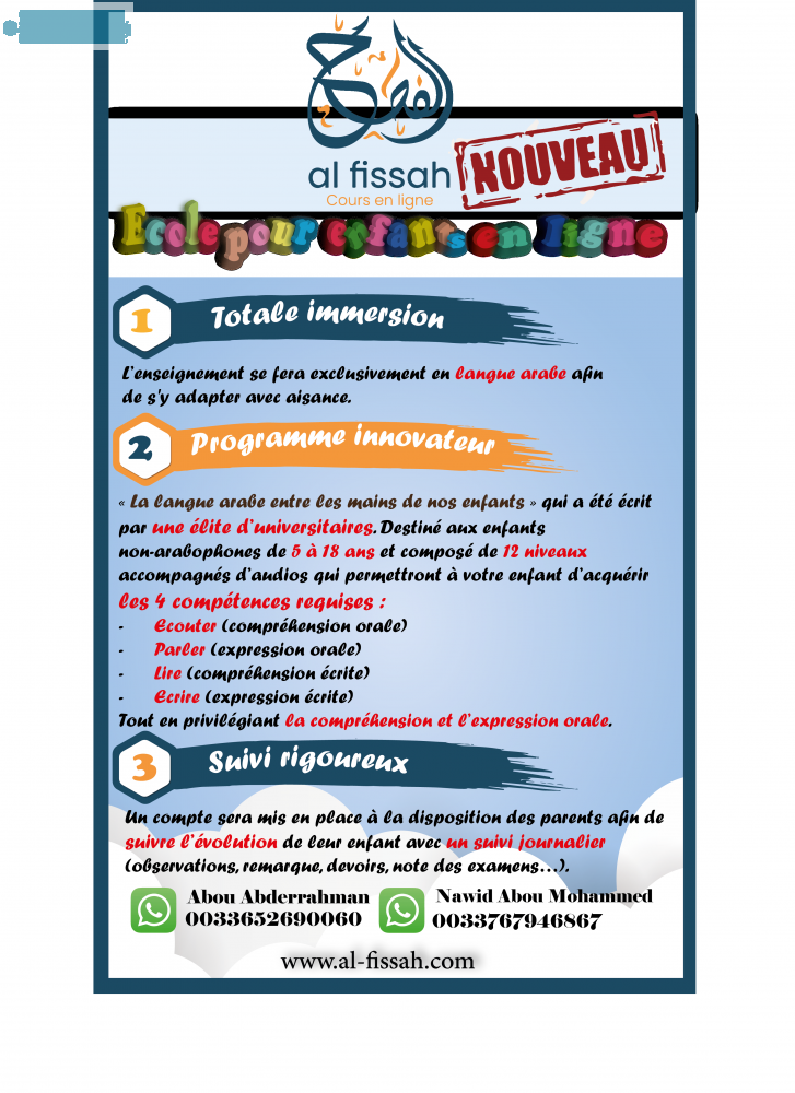 Al-fissah est un institut spécialisé dans l’enseignement des enfants non-arabophones, ayant à sa disposition des professeurs arabophones formé à l’enseignement de ceux-ci.