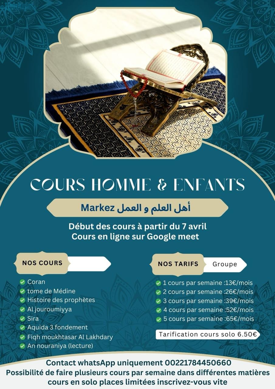 Nous y proposons des cours dans plusieurs matières (Aquida,Fiqh,Arab, Grammaire,Sira, Coran, Histoire des prophètes et des compagnons...),sur le minhaj des gens du Livre et la Sunnah avec la compréhension des pieux prédécesseurs.