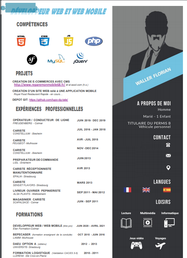 Je poursuis en ce moment une formation de développeur web/web mobile en centre de formation pour adultes et j'aimerais approfondir mes connaissances et acquérir de nouvelles compétences.