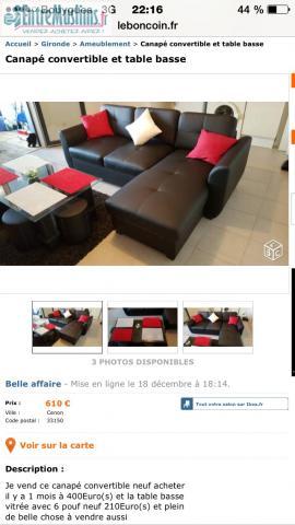 Salam alaykoum je vend un canapé convertible avec une table basse qui a 6 poufs, neuf acheter il ya 1mois facture à l'appuie . Je vend aussi d'autres ameublement me contactez si intéresser .