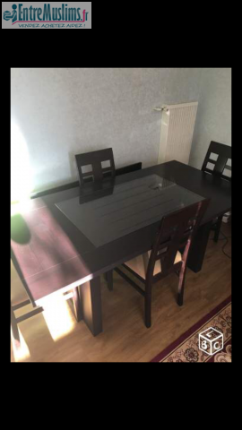 Vends table salle à manger 60x180 en tres bonne état avec ses 4 chaises en tres bonne état également.