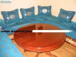 le tous est composée de2 grande table 2tissu differents(bleu comme sur la photo et lautres est un degrader de beige marron ) de 2paires de rideaux assortie de 4 banquette de 2mettre ainsi que les 4bois pour 1100eur