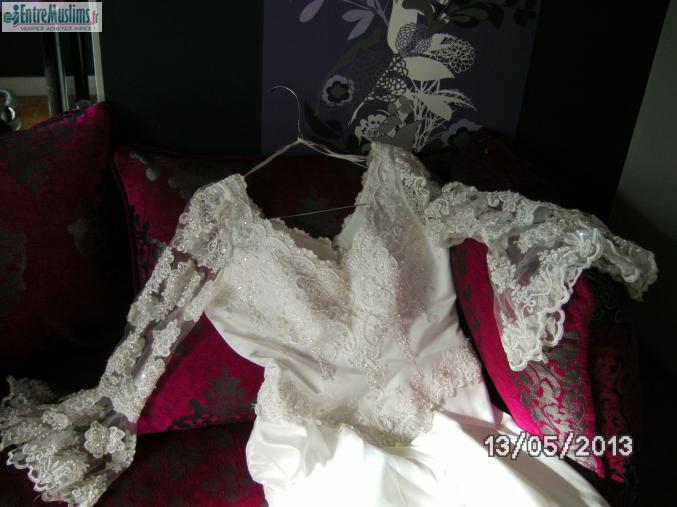 As salam alikunna je loue ma robe de mariée taille 44/petit 46 blanche manches dentelle longues traines perlées.
