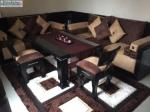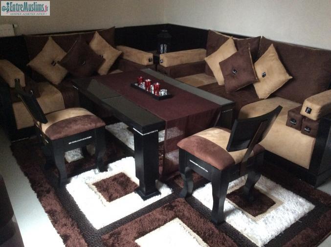 Je vend ce magnifique salon marocain moderne noir brillant avec strass composé d'une banquette avec dossier et accoudoirs 1m60, d'une banquette avec dossier et accoudoirs 2m, d'une table, 2 chaises, d'un coffre avec dossier, 2 mousses, 6 petits coussin carré, 3 grand coussin, 12 boudin carré, 2 lhafette, le tapis ainsi que les rideau beige et marron, je le vend parce que je doit déménager et manque de place il doit absolument partir. le prix reste négociable dans la limite du raisonnable acheté il y a 1ans.