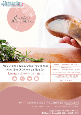Pour vous Mesdames, Ô Délices du Bien-Être ouvre ses portes à Louviers. Je vous propose plusieurs Prestations de Massages mais aussi un espace Spa Sauna. Praticienne certifiée par l'Ecole Européenne de Bien-être, je vous accueille sur RDV au 07.69.49.14.41. Problèmes gynécologiques ( cycles douloureux ou irréguliers, difficultés à être enceinte), problèmes digestifs ( colites, constipation, nausées), douleurs de dos, migraine, dépression, angoisse, stress, fatigue, insomnies, mauvaises circulation, eczéma, La Réflexologie Plantaire est là pour vous accompagner et vous aider dans vos maux du corps au quotidien. Cette pratique est un complément à la médecine traditionnelle mais elle ne doit en aucun cas se substituer à celle ci en terme de traitement et de diagnostic. * soin de confort, non esthétique et sans visée thérapeutique au sens strictement médical du terme.