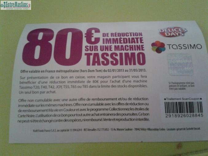 Vends bon d'une valeur de 80e pour acheter une machine de la marque tassimo, machine de votre choix.