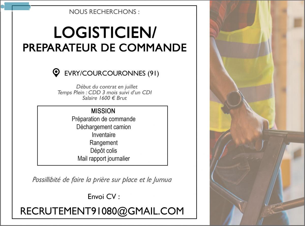 Salam aleykoum, nous recherchons un Préparateur de commande / Logisticien pour débuter en juillet à Evry dans le 91.