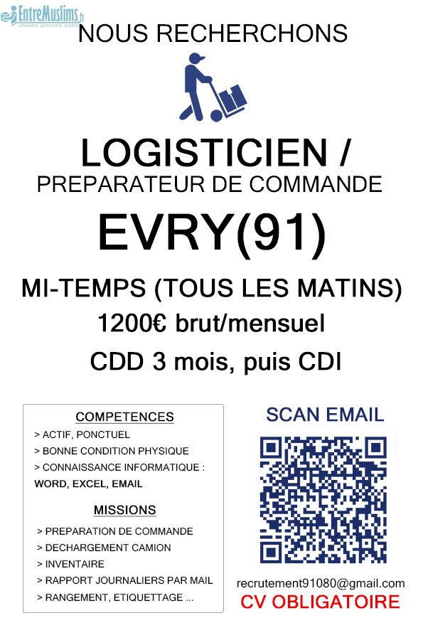 Salam aleykoum, nous recherchons un Préparateur de commande / Logisticien pour débuter rapidement à Evry dans le 91.