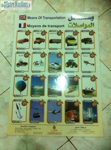 pour l'enrichissement du vocabulaire (47x67cm)(fruits/légumes/animaux/moyens de transport/contraires /métiers/verbes arabe/français/anglais )