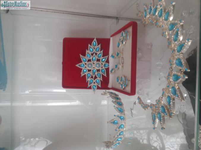 je vends cet ensemble complet pour le henna on voit mal mais la parure comprend la deco de ceinture, les broches, les boucles d'oreilles, le collier et la couronne. les dernieres photos sont des housses pour coussin (2 petites et 1 grande)