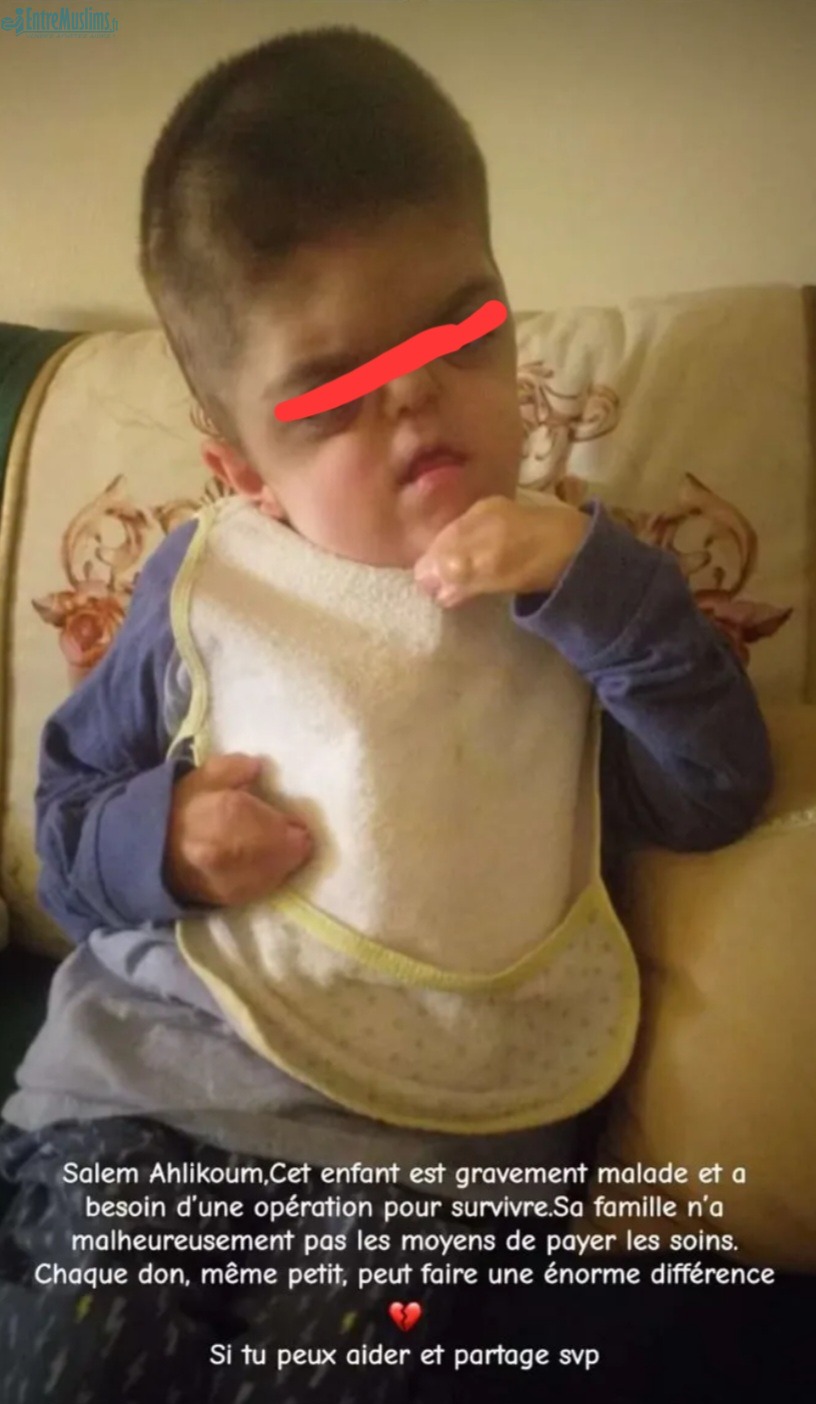 Un enfant gravement malade au Maroc à besoin d'aide pour son opération je ne sais pas quel type d'aide est autorisé à demander donc j'accepte tout ce qui pourrait l'aider en vêtements médicaments etc je joins da photo et je reste joignable si besoin de plus d'informations Allah i chafih il a besoin d'un max de douas barakallahoufikoum