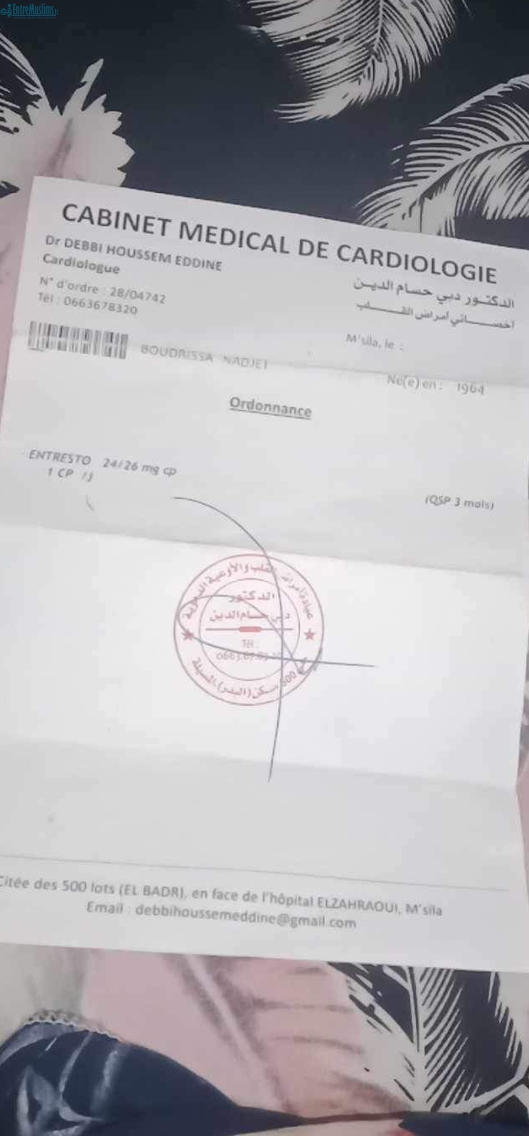 Salam Aleykoum une dame en Algérie gravement malade du cœur à besoin d'un médicament en urgence ENTRESTO 24/26 MG elle a beaucoup d'eau dans le cœur.