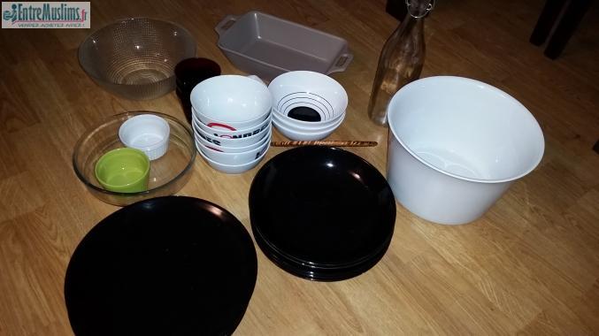 Cette annonce s’adresse aux personnes dans le besoin et non pour la revente. Une sœur fisabillillah donne toute sa vaisselle, un fer à repasser, des plaques chauffante style panini, des plaques (à nettoyer désolé par manque de temps nous n’avons pas pu le faire), des boites plastiques, des assiettes plates, assiettes creuses, des verres, des verrines desserts, des moules à gâteaux, un égouttoir, un range ustensiles, un sac à linge, un étendoir à linge, deux cendrier déco, 4 shampoings neufs, deux chaises tabouret en cuir, un fauteuil blanc à rafraîchir mais propre, un plaid, un vase. Voir LES PHOTOS ;