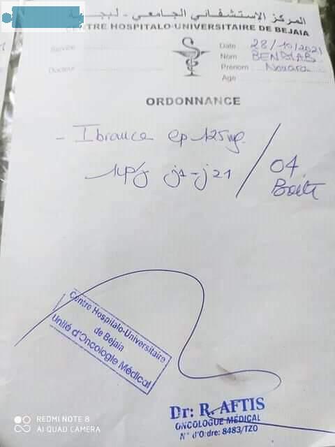 Ibrance 125mg, en Algérie elle trouve pas apparemment, et la boîte c'est environ 2500€, et lui en faut 4 incha'Allah. Donc toute solution est à étudier dans le respect des limites d'Allah. Les documents justificatifs sont ici.