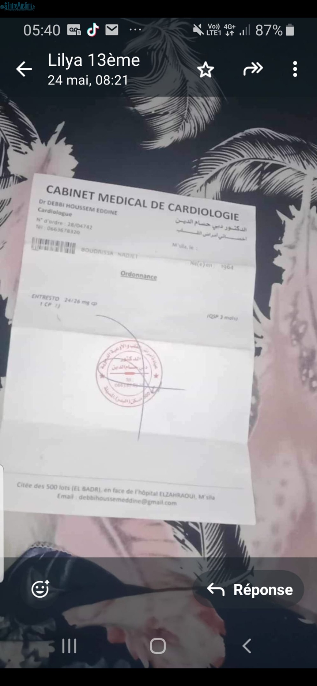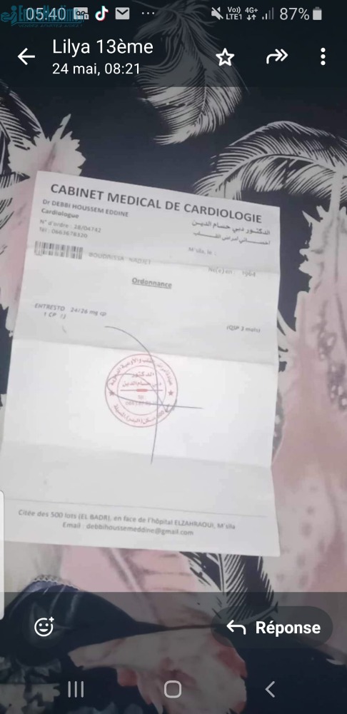 Je cherche en urgence un médicament pour le cœur pour une dame malade qui souffre d'insuffisance cardiaque elle se trouve en Algérie ma cousine part bientôt elle pourra lui remettre j'ai l'ordonnance le médicament s'appelle ENTRESTO 24/26 Mg .