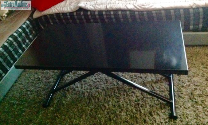 Bonjour, a vendre table basse relevable plateaux bois noir laquée Dimensions : longueur 1m20, largueur 60 cm, hauteur relevable de 15cm a 74 cm en bonne état.