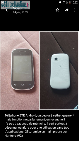 Je vends un smartphone ZTE, usé estethiquement mais fonctionne parfaitement. Sert surtout à dépanner ou à une petite utilisation des applications car il n'a pas beaucoup de mémoire.