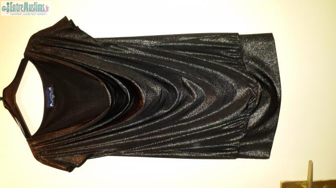 Couleur Argenté reflets brillants. Joli drappé sur le devant. Matière fluide légère et très douce et agréable type lycra.