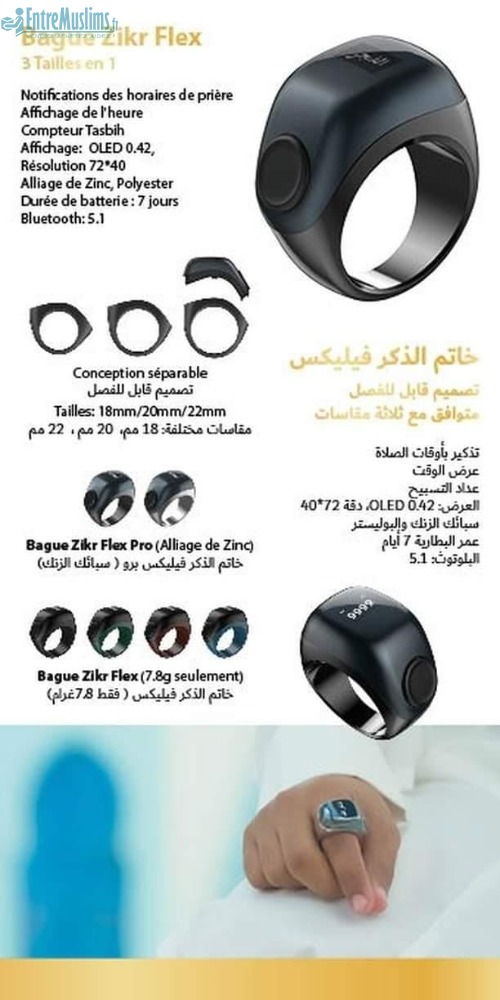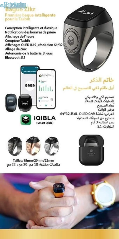 Bague Tasbih intelligente islamique avec affichage de l'heure compteur tasbih jusqu'à 9999 vibre au nombre souhaité... et rappel des horaires de prière.