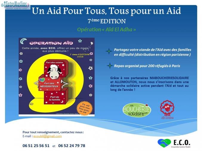 Après le succès des opérations « Un Aïd pour tous, tous pour un Aïd-2015» et « Un Repas pour Tous, Tous pour un Repas -7ème Edition » grâce à l'implication des bénévoles et à la générosité des donateurs, l’association Ensemble contre l’Oubli (ECO) vous invite à sa nouvelle opération en partageant ce moment de fête et de solidarité par vos dons qui nous permettront de financer l’achat d’agneaux sacrifiés pour l’Aïd, qui seront ensuite directement redistribués à des familles dans le besoin.