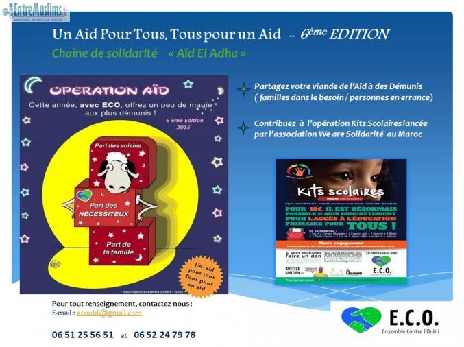 Après le succès des opérations « Un Aïd pour tous, tous pour un Aïd-2014» et « Un repas pour tous, tous pour un repas -6ème Edition » grâce à l'implication des bénévoles et à la générosité des donateurs, l’association Ensemble contre l’Oubli (E.C.O), vous invite à sa nouvelle opération en partageant ce moment de fête et de solidarité par votre don de Tiers de mouton prévu à cet effet, aux familles dans le besoin.