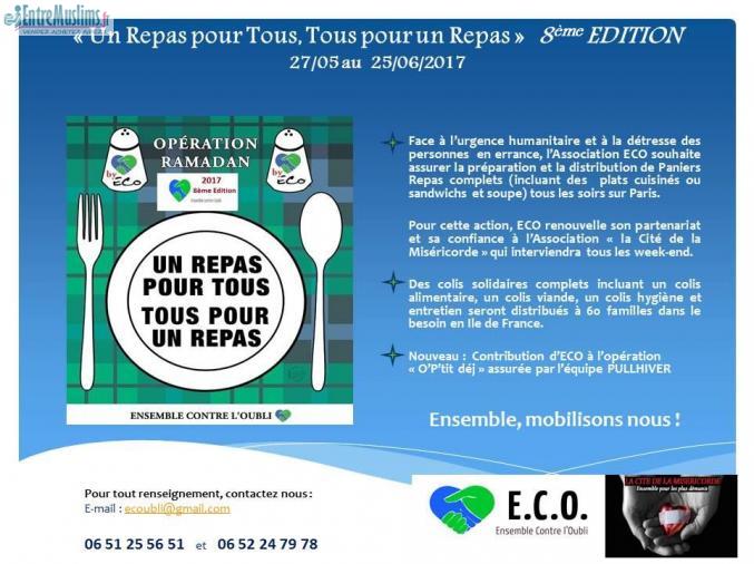 Après le succès de notre précédente opération " Un Repas pour Tous, Tous pour un Repas" où nous avons pu assurer la distribution de 5 412 paniers repas durant un mois, complétés de 57 colis solidaires complets, l'Association E.C.O.(Ensemble Contre l'Oubli) renouvelle cette opération pour l'année 2017 et son partenariat avec l’Association Cité de la Miséricorde et à l’honneur de vous convier à l’action :