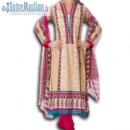 Jolie Churidar Delhi composé de 3 pièces d'une très longue tunique beige à motifs bleu, rose et rose foncé, d'un pantalon serré rose et d'un châle assorti.