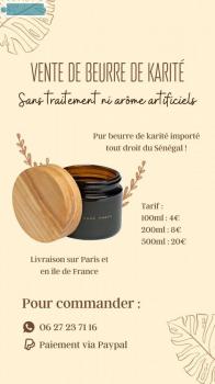 Je vends du beurre de karité en tant que particulier ayant commandé un petit stock du Sénégal. Je propose des remises en main propre en Ile-de-France ou des envois par la poste.