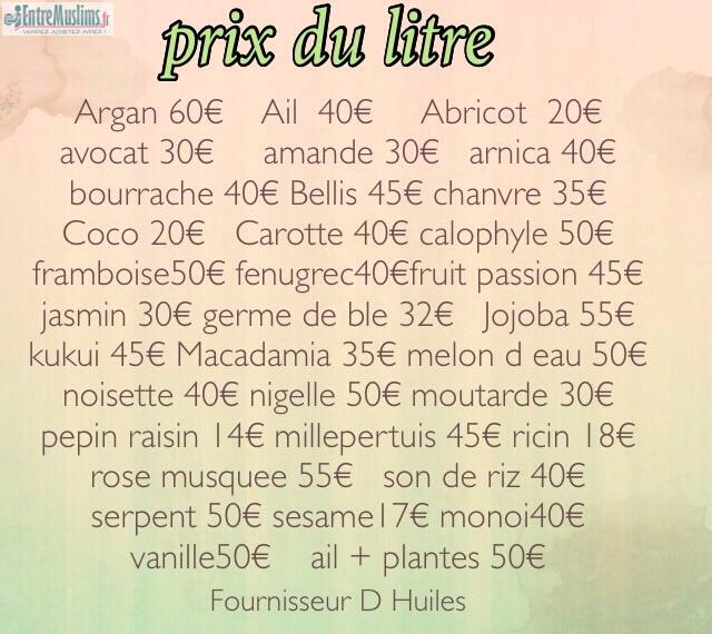 Salam Alekoum je vend des huiles 100% naturelle en litre remise sur Paris pu envoi par la poste ou mondial relay selon votre choix , des dizaines de clients satisfait depuis plusieurs années el hamdoullillah , les prix sont sur la photo sur le site , contactez par mail ou SMS que si réellement' intéresser afin d eviter de perdre votre temps et le mien , merci 0789012479