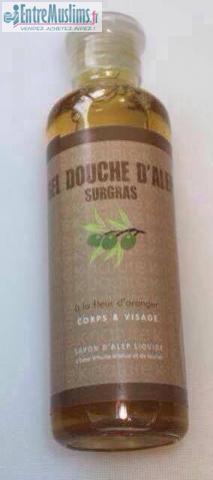 Gel douche d Alep 300ml : composition , huile d olive première pression , huile de baie de laurier , huile de nigelle , eau purifiée , hydroxyde de potassium . Lot de 10 a 35e . Revente entre 6e et 8e