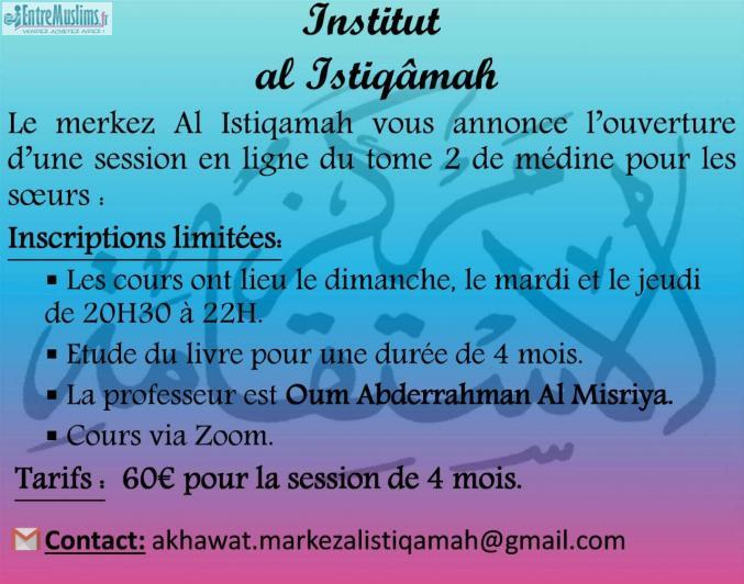 Le merkez al istiqamah vous annonce l'ouverture d'une session en ligne tome 2 de medine pour soeurs avec la professeur Oum Abderrahman.