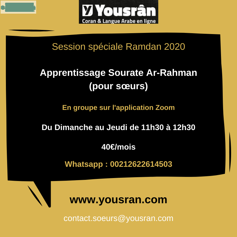 L'Institut Yousrân (minhaj ahlou as-sounnati wa al-jamâ'a) est heureux de t'annoncer l'ouverture d'une session intensive pour l'apprentissage de sourate Ar-Rahman 5j/7 durant Ramadan إن شاء الله (pour les soeurs) :