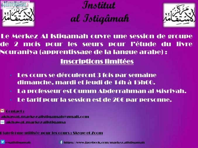 L'institut al Istiqamah spécialiste dans l enseignement en ligne pour les non arabophones vous propose une session de 2 mois (3 cours par semaine) avec l'etude du livre an nouraniya pour debutantes afin d'apprendre a lire et a ecrire.