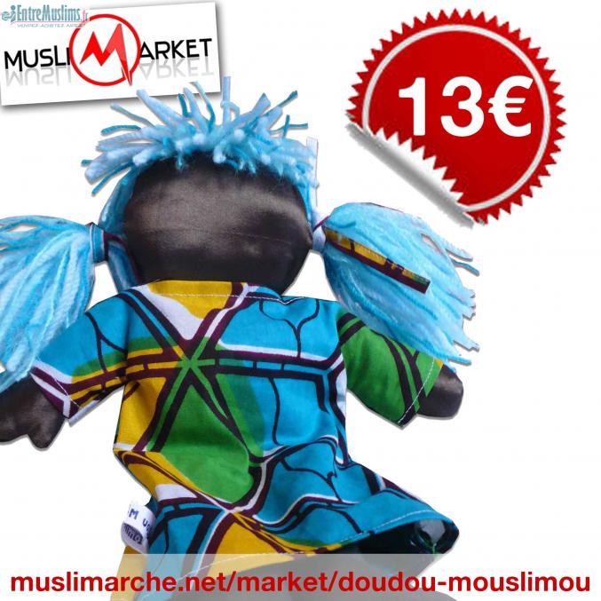 Bintou la poupée chiffon avec sa robe en wax et ses cheveux en laine un camaieu de bleu