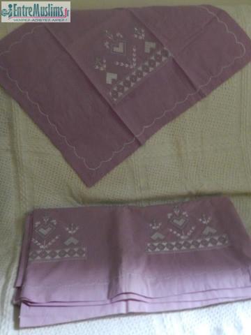 je vend cette parure de lit oriental TOUTE NEUVE couleur violet claire brodé au fil blanc et argenté digne des lits des princesses de mille et une nuit, cette parure se compose de ; parure de lit + 2 taie d oreiller (UN MIROIR ORIENTAL ASSORTIE VOUS EST OFFERT)