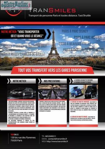 Nous sommes une entreprise de transport de personnes basé à Paris pouvant accompagner jusqu'à 7 personnes ou vous le souhaitez (aéroport, gares, shoppings, rdv médicaux). Nous faisons du transport local et national. Une conductrice voilée titulaire du permis D se tient à votre disposition pour tout trajet entre femme à des tarifs défiant toute concurrence.... Elle se propose également d'être interprète si vous n'avez pas le temps d'accompagner votre mère, sœur ou femme à leur rdv et ceci gratuitement, seul le trajet sera facturé. N'hésitez pas à nous contacter au 0652049211 ou sur www.transmiles.fr
