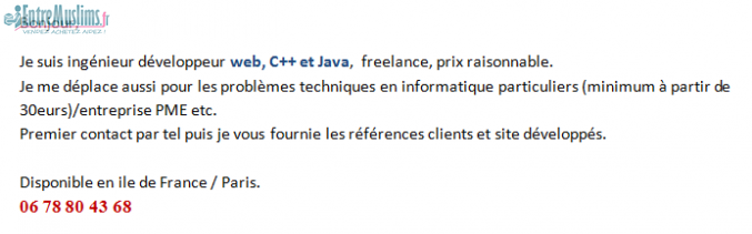 Je suis ingénieur développeur web, C++ et Java, freelance, prix raisonnable.