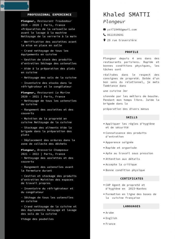 Je recherche un emploi en tant que lave-vaisselle ou aide-cuisinier