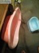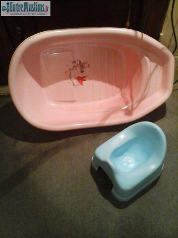 voici une baignoire rose et les deux pots d'apprentissage pour aller aux toilettes.