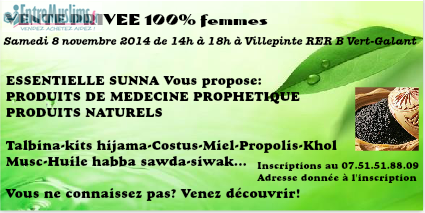 Je vous propose de venir découvrir mes produits lors d'une vente privée le 8 novembre inshallah. Un buffet est prévu. Il n'y a pas d'obligation d'achat, on peut simplement venir se renseigner.