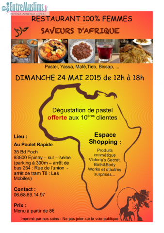 As salamou aleykounna En famille, entre amis, entre sœurs, vous êtes toutes les bienvenues... Un espace RESTAURATION et un espace SHOPPING seront mis à votre disposition L' espace restauration HALAL régalera vos papilles avec la gastronomie sénégalaise: Tieb, Yassa, Pastels, Jus de Bissap, Jus de Gingembre et pleins d'autres... L'espace shopping vous permettra d'être la plus belle : Des cosmétiques (brumes, lotions, gommages, parfums...) de Chez Victoria's Secret La marque Gloss! Bath&Body Works et pleins d'autre surprise !!! Et tout cela dans une ambiance très conviviale ! Alors Mesdames retenez cette date le dimanche 24 mai 2015 Au Poulet Rapide 35 Boulevard Foch, 93800 Épinay-sur-Seine à partir de 12h Entrée gratuite Pour plus d'informations contacter le 06.68.69.14.97