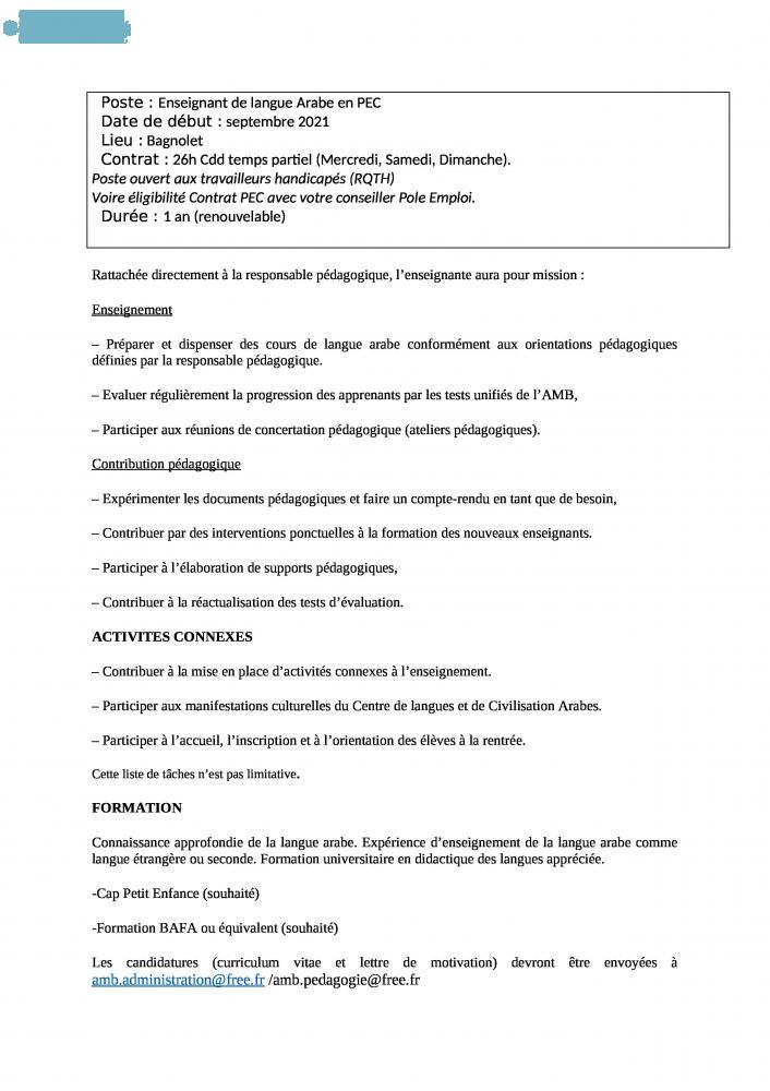 Connaissance approfondie de la langue arabe. Expérience d’enseignement de la langue arabe comme langue étrangère ou seconde. Formation universitaire en didactique des langues appréciée.