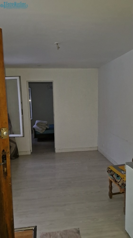 Entrée dans salon, une chambre, cuisine et salle d'eau avec wc.