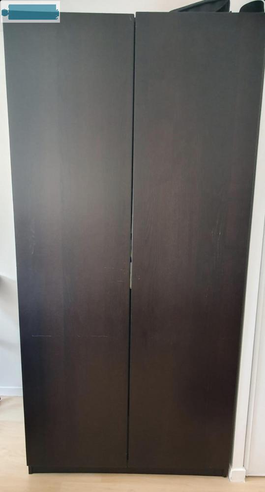 Armoire Ikea wengé en très bon état en 2 éléments : 1 meuble H200xl100xp60 qui se compose d'un caisson de rangement + 1 colonne H200xl50xp60 qui se compose de 4 étagères et 3 caissons de rangement.