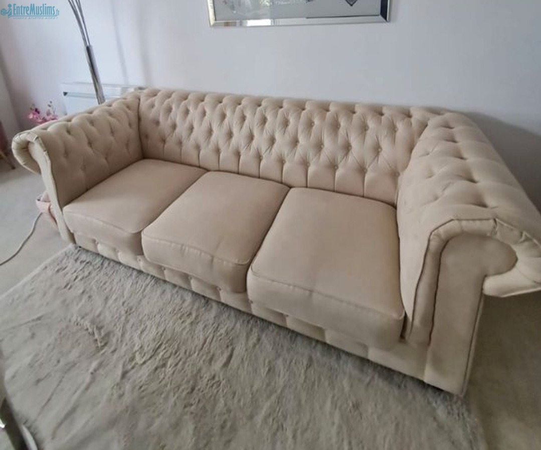 Je vends mon canapé capitonné en velours beige toujours couvert et en excellent état.